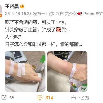 王晓晨突然发博这波其实有点耐人寻味了,说自己吃错药心悸、打针还把血管扎破,手都肿了。